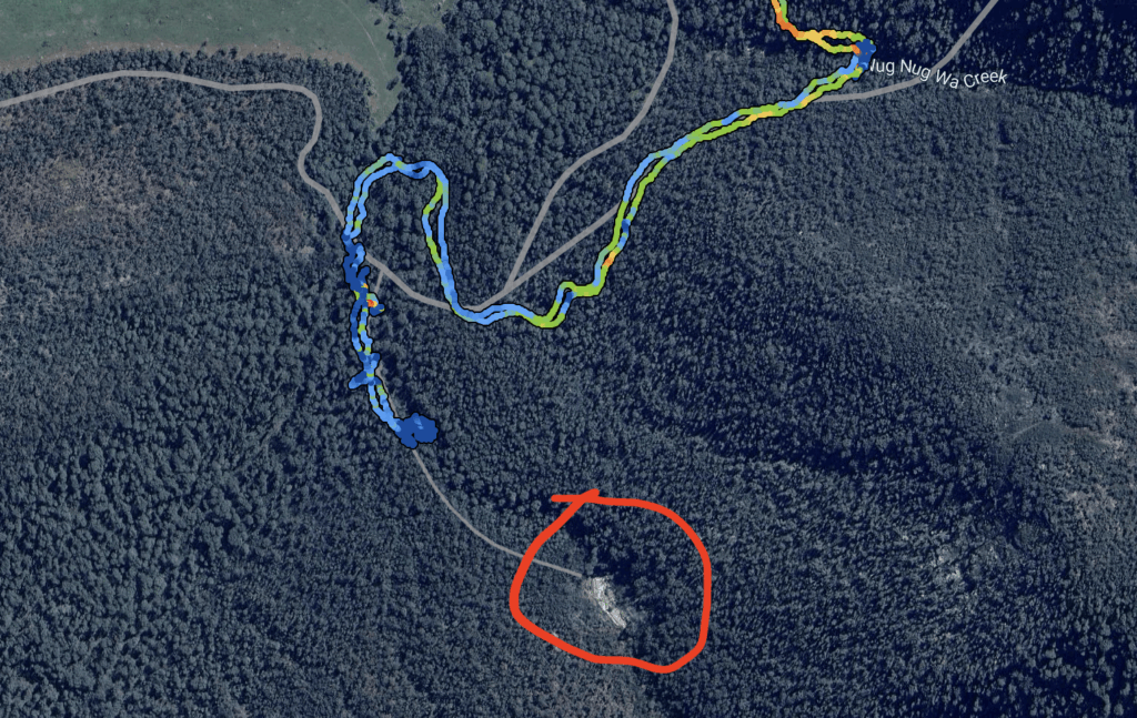 So had we found it? Looking at my Garmin GPS tracking, no we hadn’t—on the map the access track clearly continues past our lunch spot and the satellite view shows a much larger clearing than the one we stopped at. Bugger.